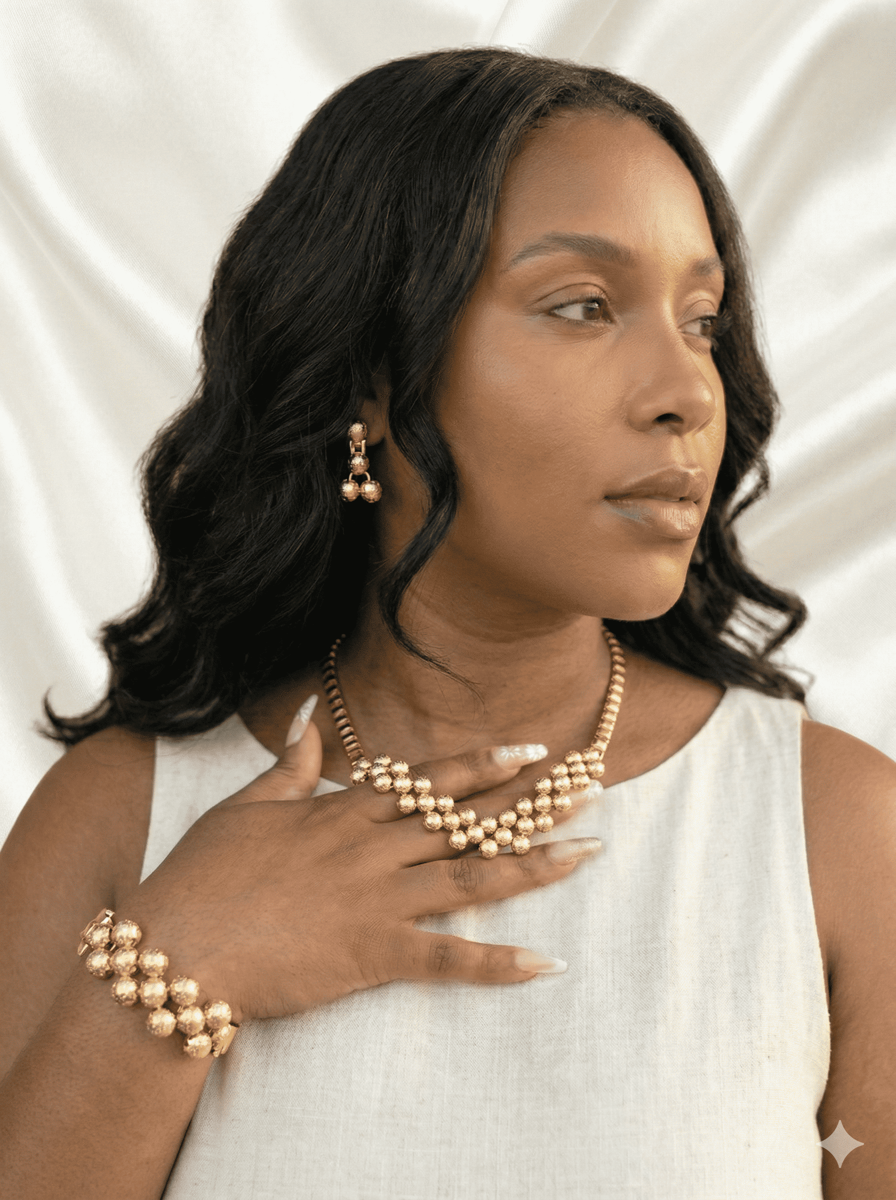 طقم مجوهرات ذهبية أنيق يتكون من عقد وسوار وأقراط بتصميم كرات ذهبية متناسقة تضيف لمسة فخامة وجاذبية للإطلالة. يتميز بتصميم كلاسيكي راقٍ يناسب المناسبات والإطلالات اليومية الأنيقة.