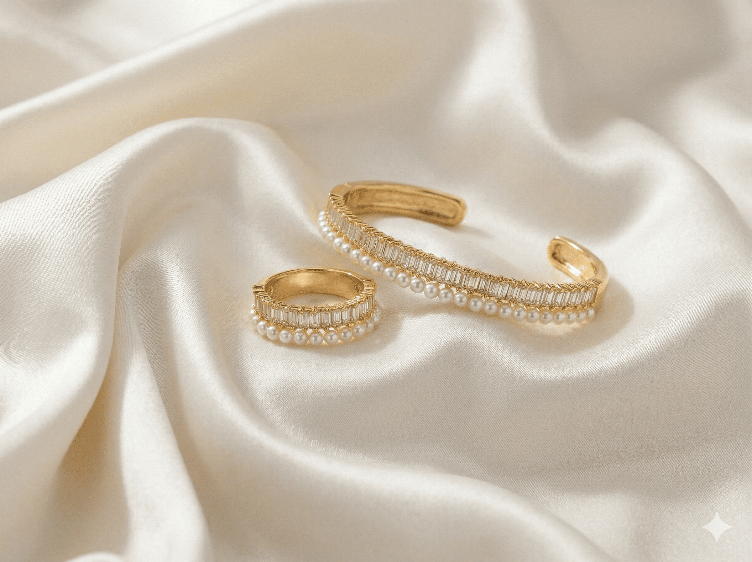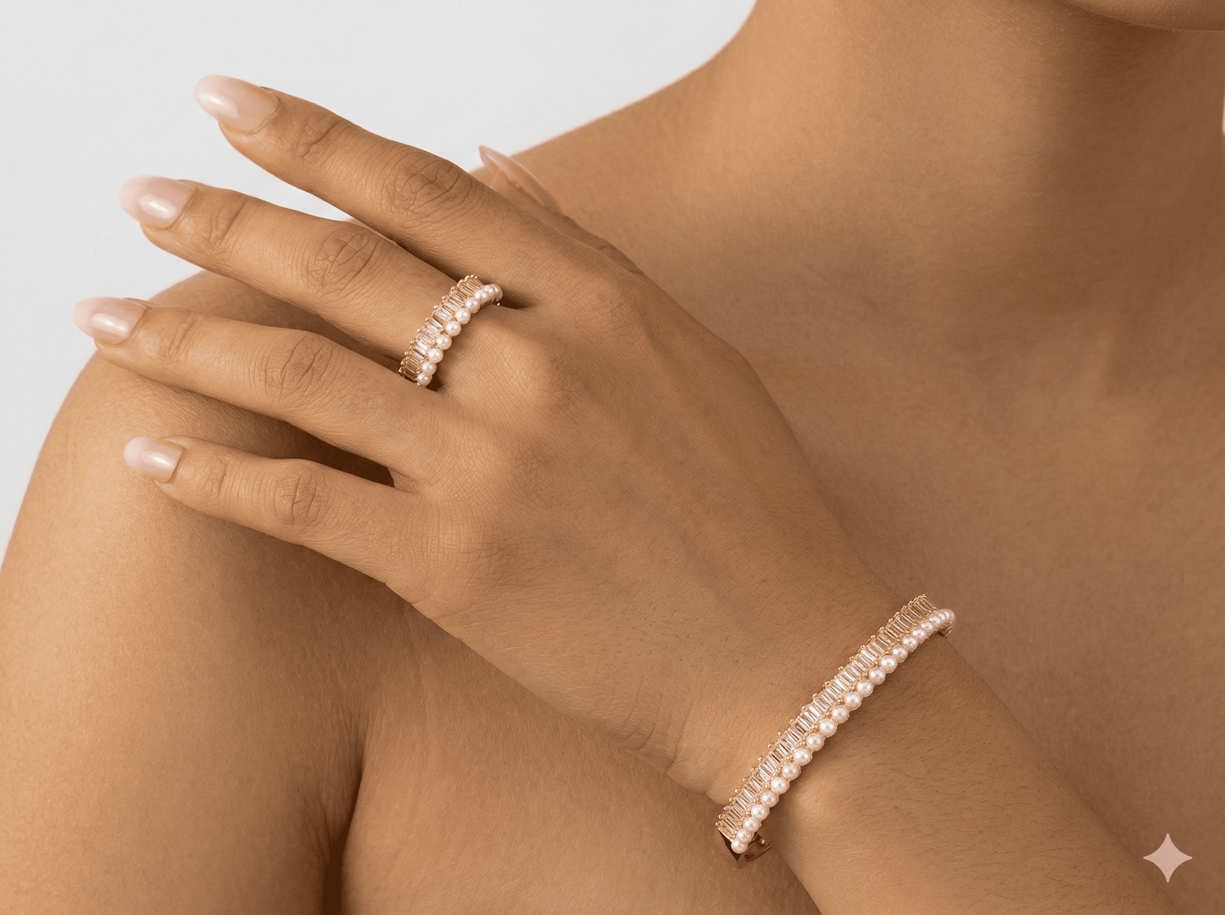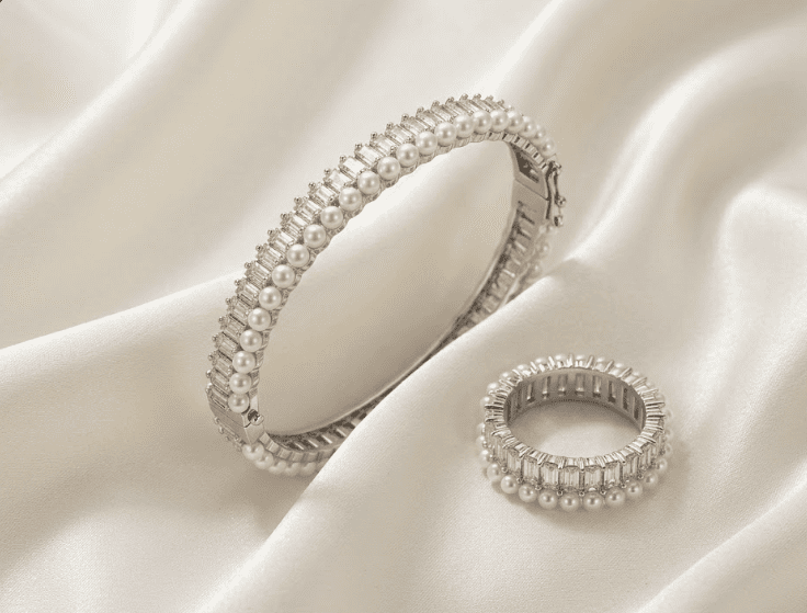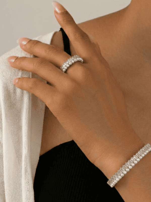 طقم مجوهرات أنيق يتكون من سوار وخاتم بتصميم راقٍ يجمع بين بريق الكريستال وجمال حبات اللؤلؤ المتناسقة. يمنح التصميم لمسة فخامة وأنوثة مميزة، مما يجعله مثالياً للمناسبات والإطلالات الراقية.