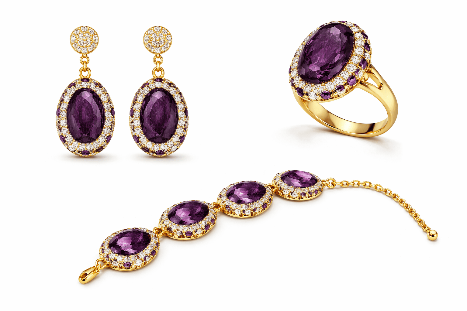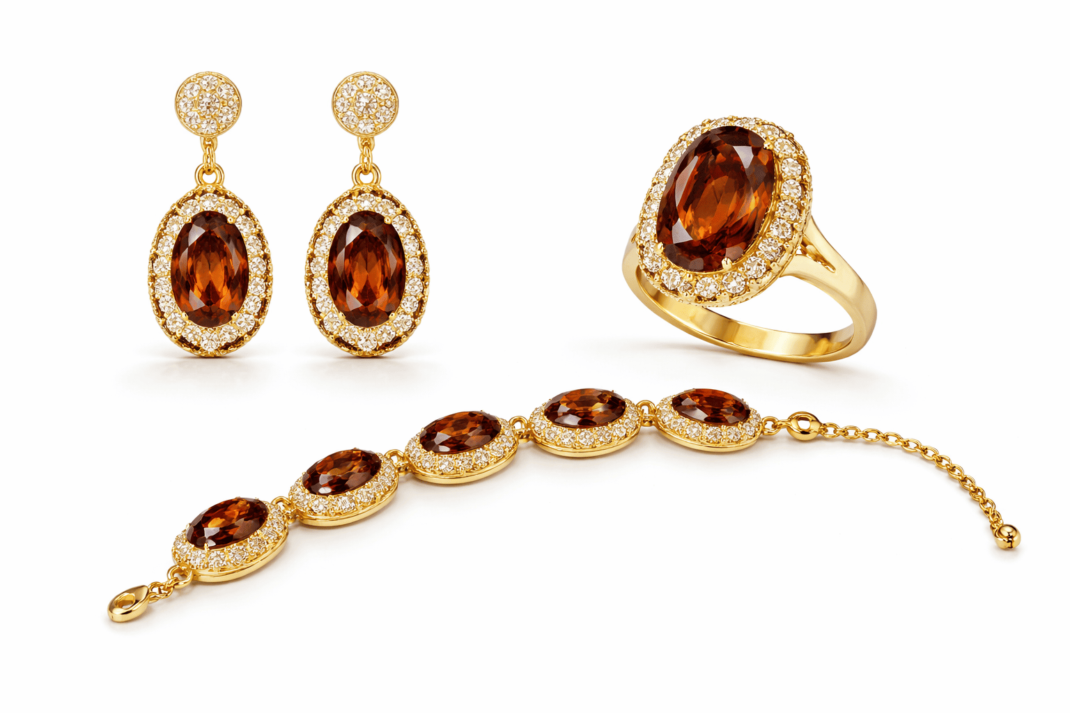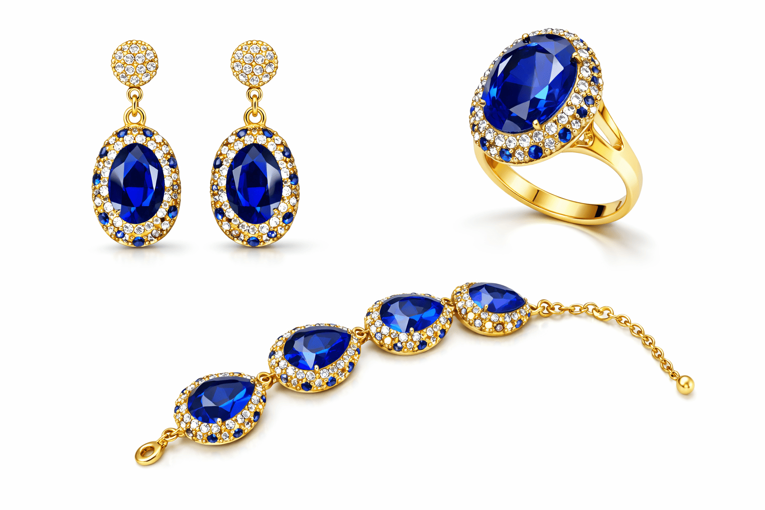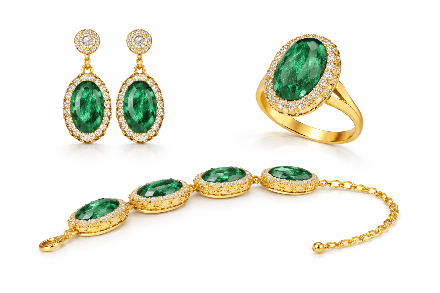 طقم مجوهرات فاخر يجمع بين الأناقة الكلاسيكية والفخامة العصرية، يتكون من أقراط متدلية وخاتم أنيق وسوار مميز. يتوسط كل قطعة حجر بيضاوي لامع محاط بإطار مرصع بكريستالات براقة تضيف لمسة من التألق والرقي، مع تشطيب ذهبي فاخر يعزز جمال التصميم. يتميز الطقم بتفاصيل دقيقة تمنحه مظهراً راقياً يناسب المناسبات الخاصة والإطلالات الفاخرة. يتوفر الطقم بعدة ألوان جذابة ليمنحك حرية اختيار ما يناسب ذوقك وإطلالتك. ✨