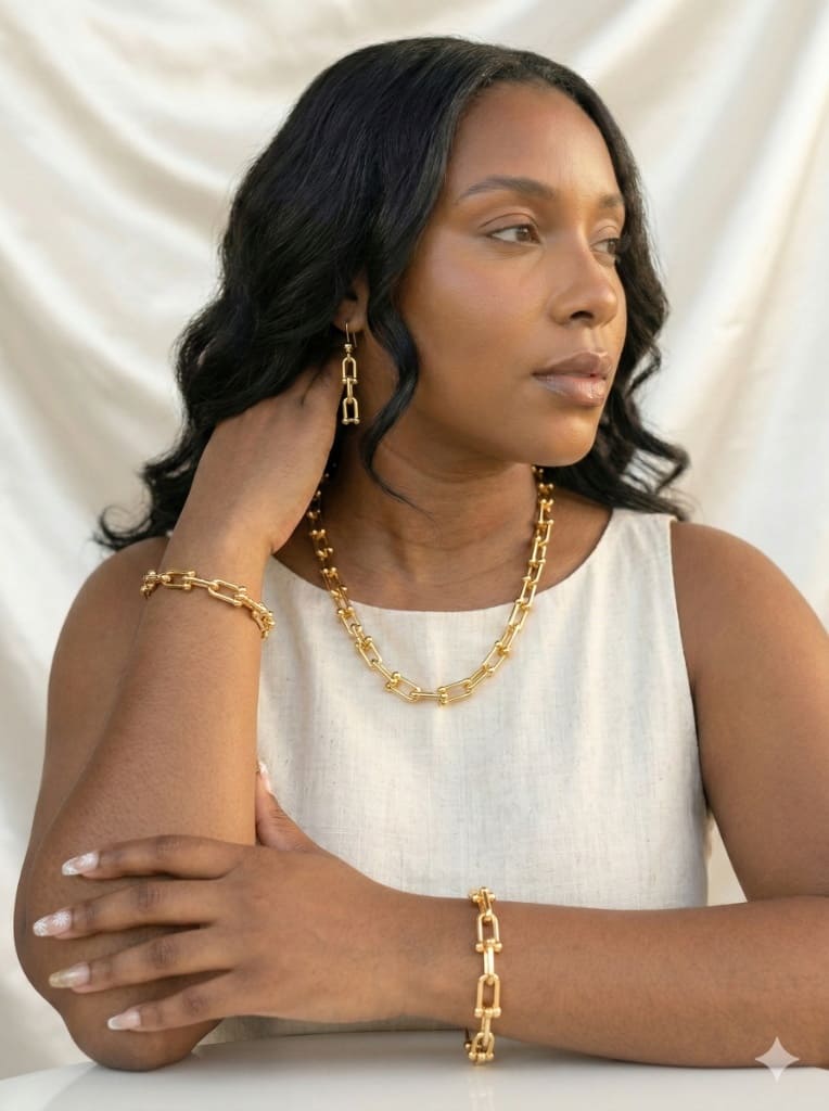 سلسلة ذهبية بتصميم عصري مميز من حلقات مترابطة تمنح إطلالة أنيقة وجذابة. يمكن تنسيقها بسهولة مع الأقراط والسوار لإكمال مظهر متناسق يجمع بين البساطة والفخامة، مما يجعلها خياراً مثالياً للمناسبات والإطلالات اليومية الراقية.