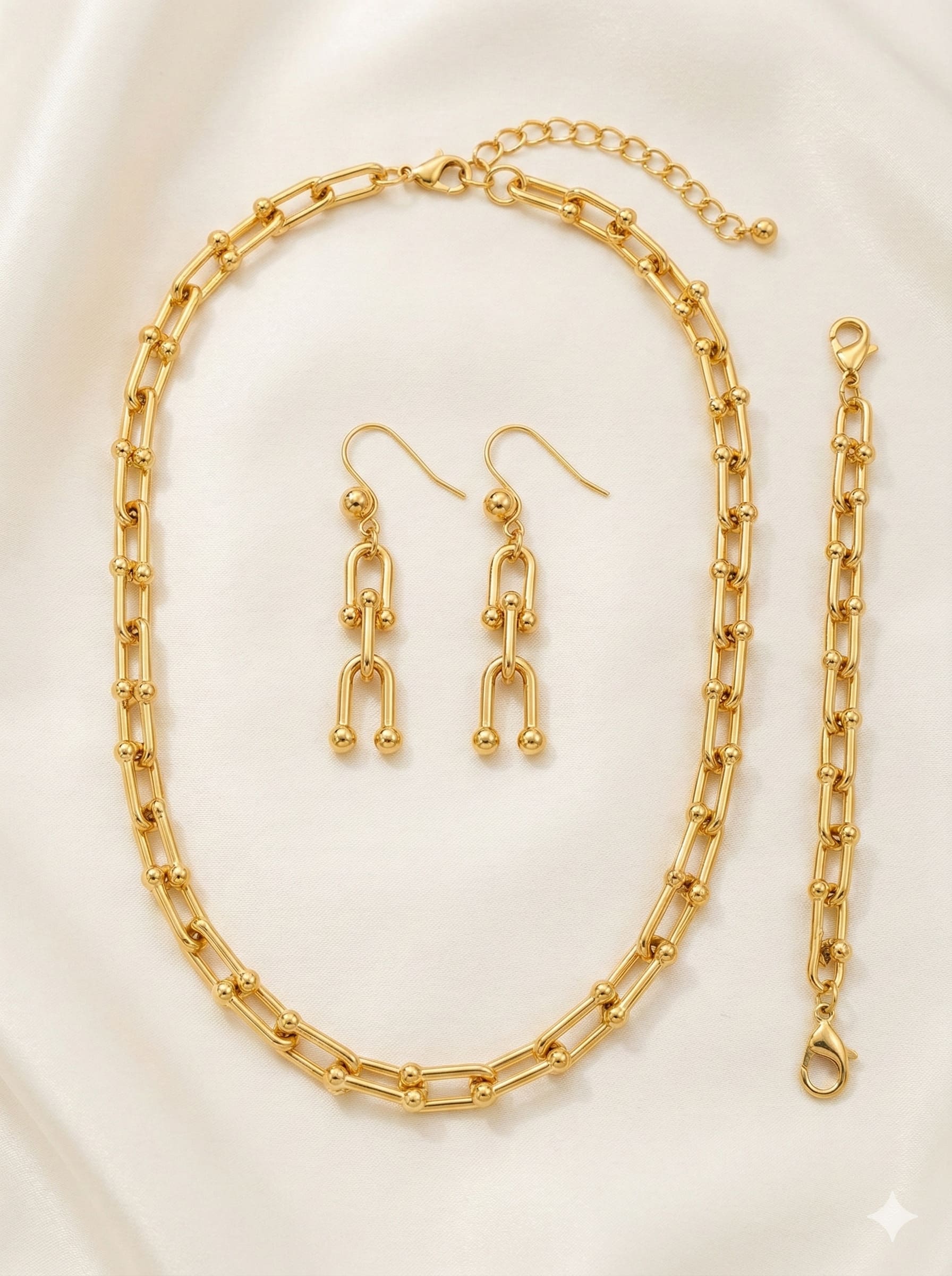 سلسلة ذهبية أنيقة مع أقراط وسوار بتصميم حلقات متصلة