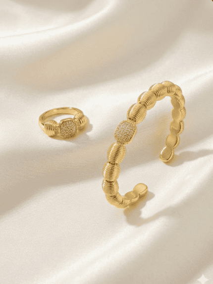 طقم مجوهرات أنيق يتكون من سوار مفتوح وخاتم بتصميم كرات ذهبية متناسقة تضفي لمسة فخامة وجاذبية. يجمع التصميم بين البساطة والأناقة ليكمل الإطلالة العصرية في المناسبات والإطلالات اليومية.