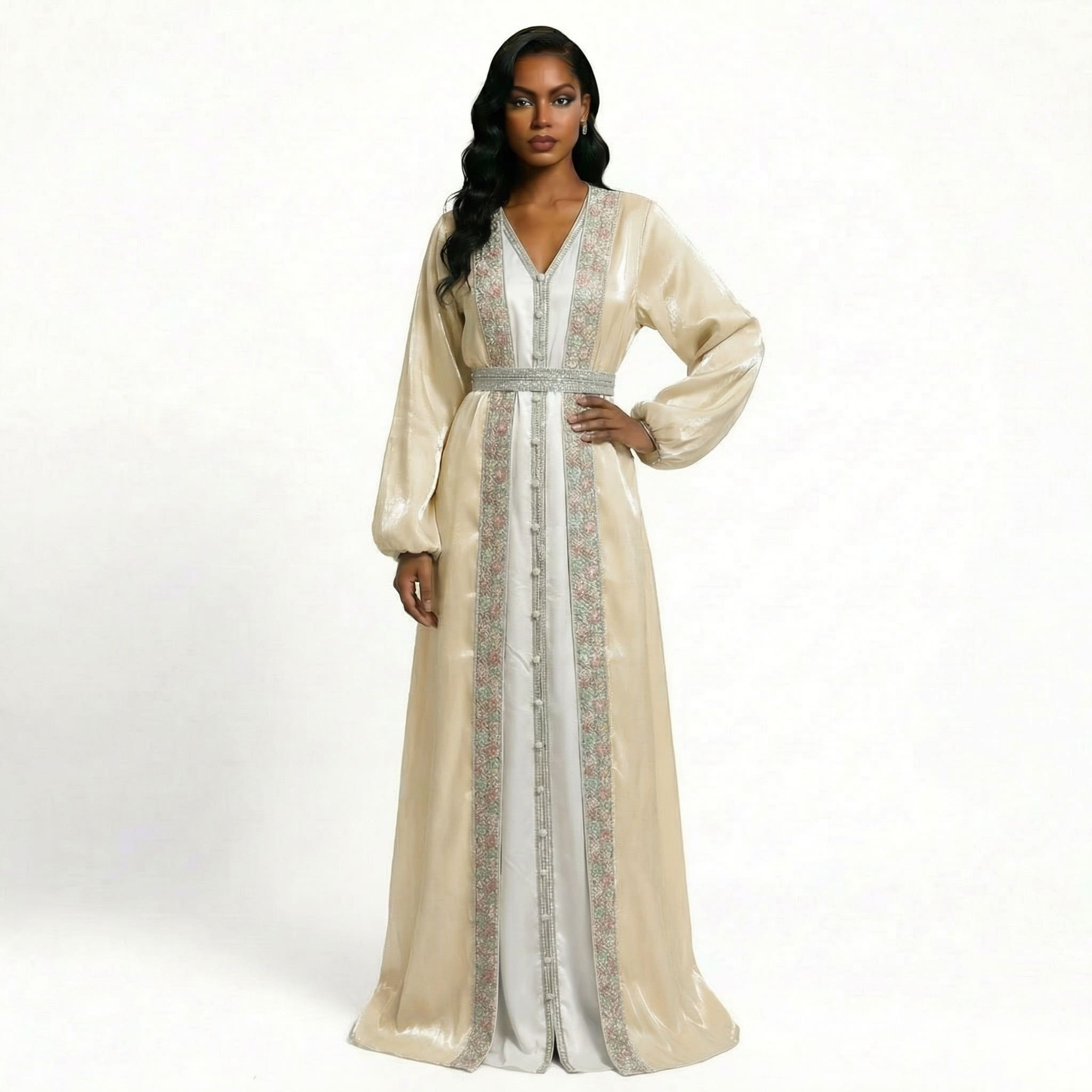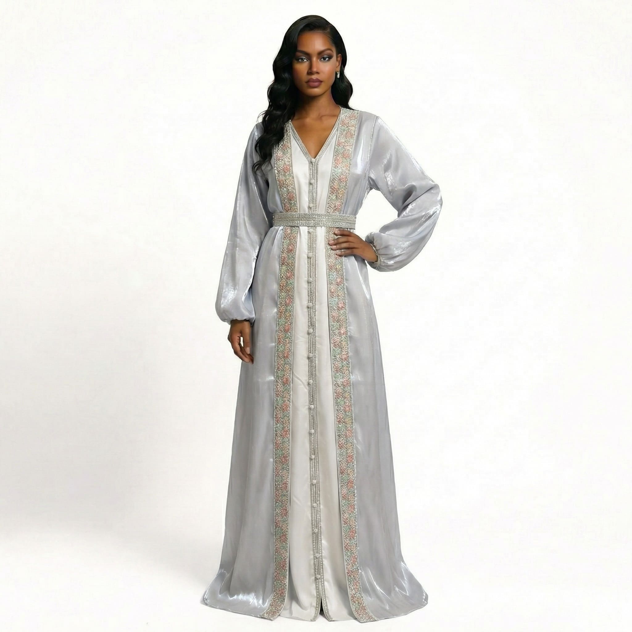 يتميز التصميم بتفاصيل تطريز أنيقة تمتد على طول الجلابية لتضفي لمسة فنية راقية مستوحاة من جمال الزخارف الكلاسيكية، بينما يمنح القص الطويل والأكمام الواسعة إحساساً بالراحة والأناقة.