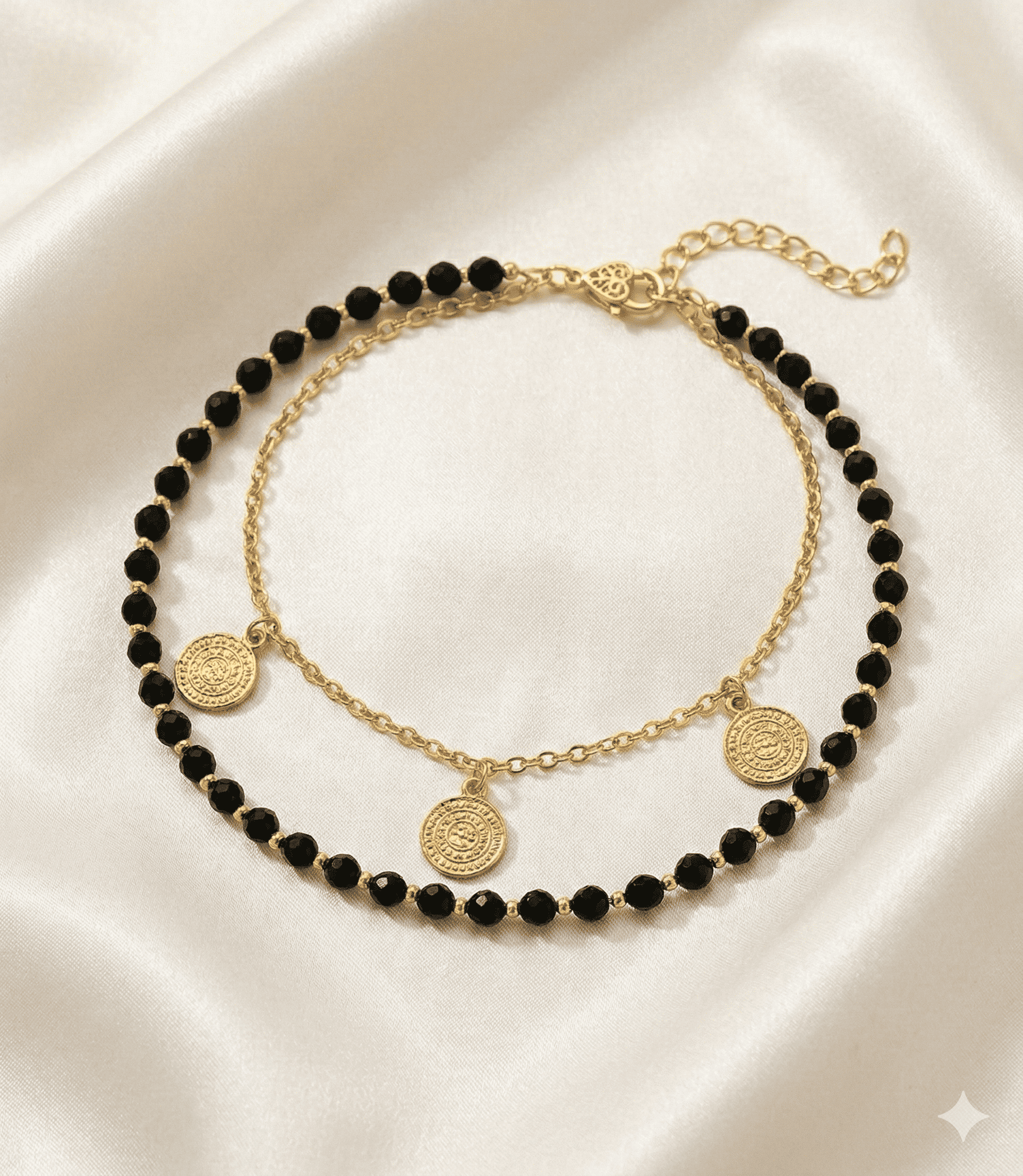 خلخال أنيق بتصميم يجمع بين السلسلة الذهبية وحبات سوداء لامعة مع تعليقات دائرية ذهبية تضيف لمسة فخامة وجاذبية. تصميم أنثوي مميز يزين الكاحل ويكمل الإطلالة العصرية سواء في المناسبات أو الإطلالات اليومية.