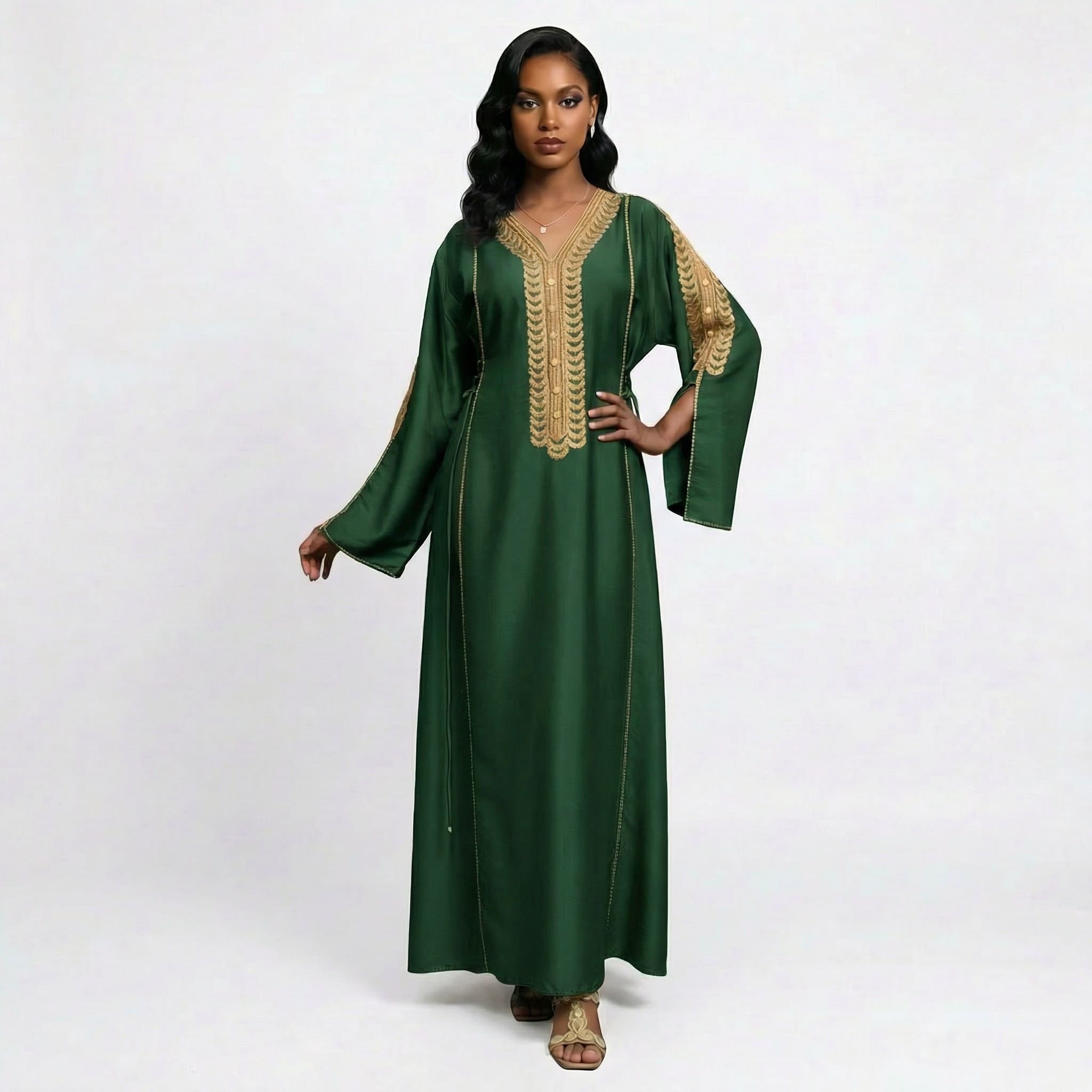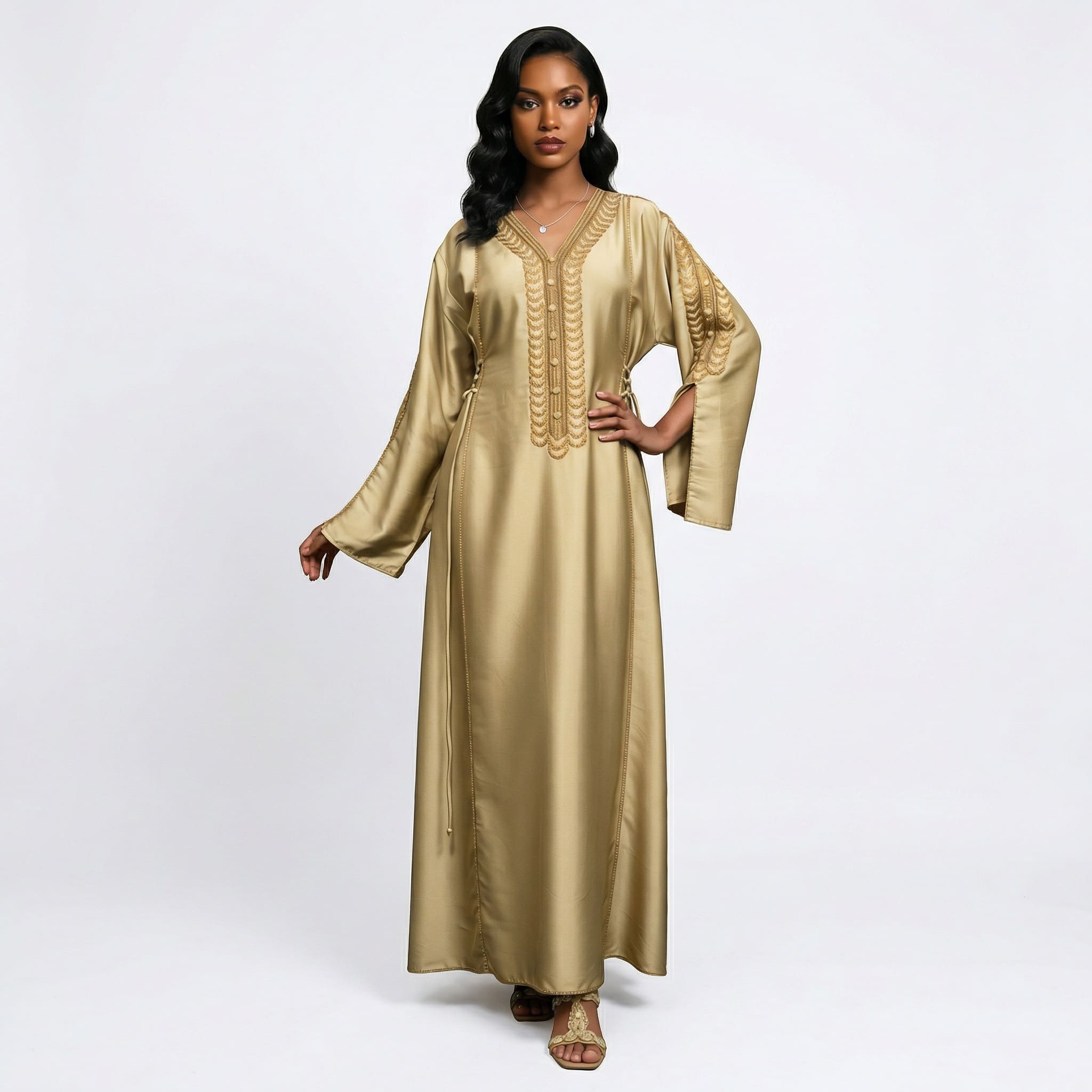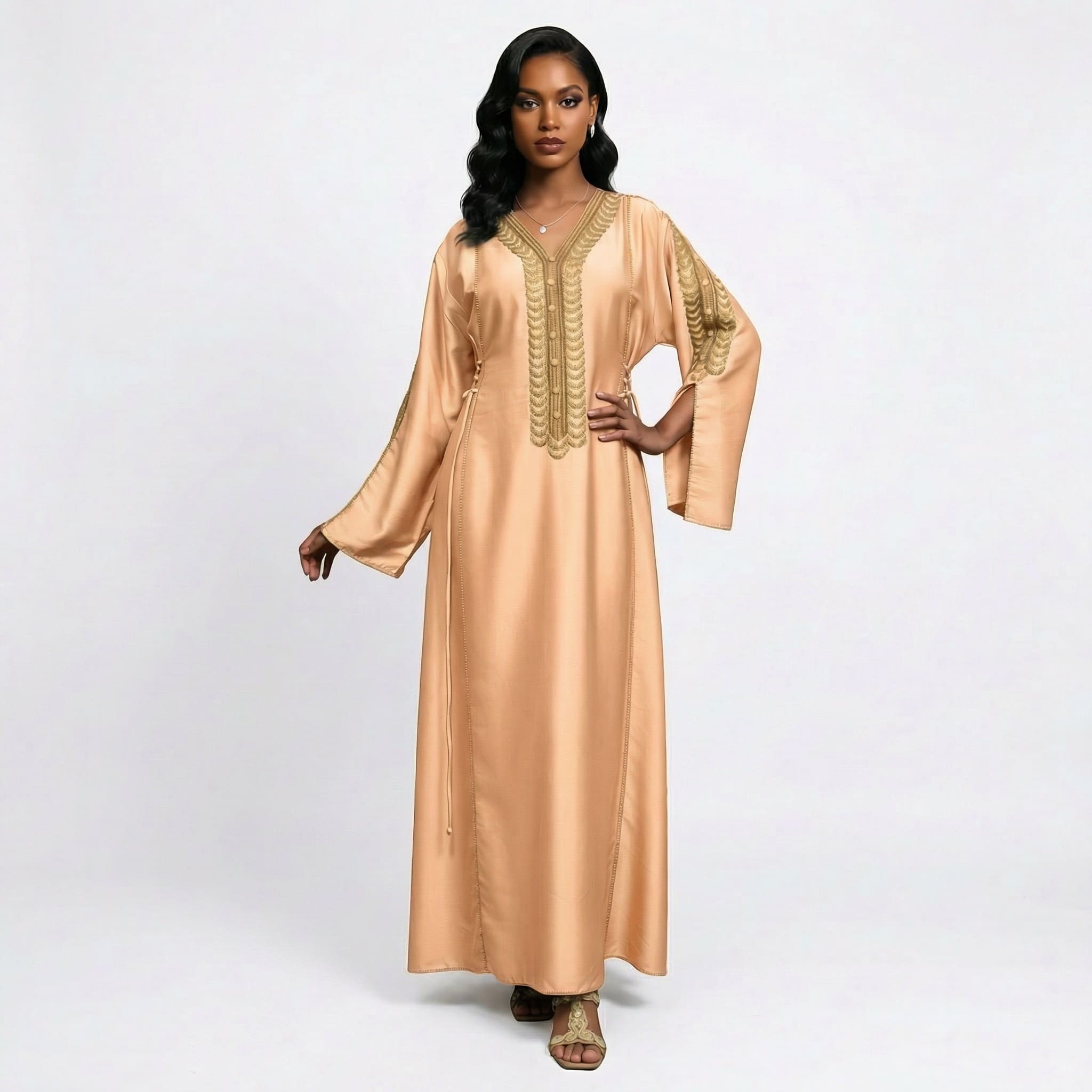 سلطانة الأناضول جلابية فاخرة مستوحاة من أناقة الأزياء العثمانية التي عُرفت برقيها وجمال تفاصيلها. يتميز التصميم بقصّة انسيابية من قماش فاخر ناعم ينسدل بأناقة ليمنحك إطلالة أنثوية راقية. يزين الجلابية تطريز ذهبي فاخر على منطقة الصدر والأكمام مستوحى من الزخارف العثمانية، ليضفي لمسة من الفخامة والتميز. تصميم مثالي للمناسبات والإطلالات الراقية التي تجمع بين التراث والأناقة العصرية.
