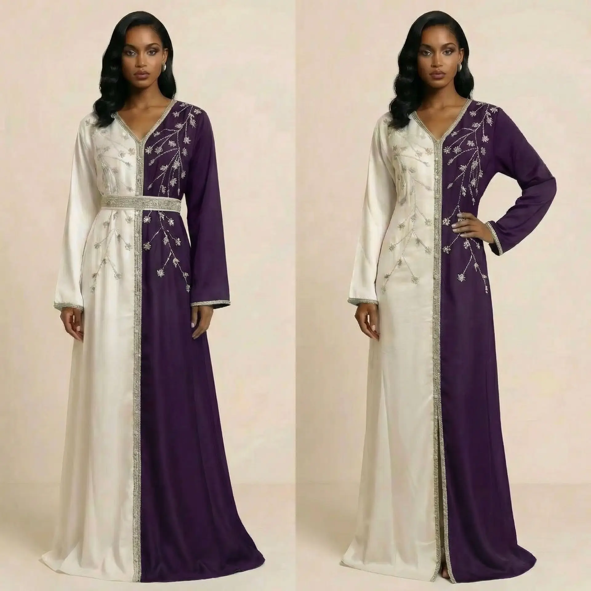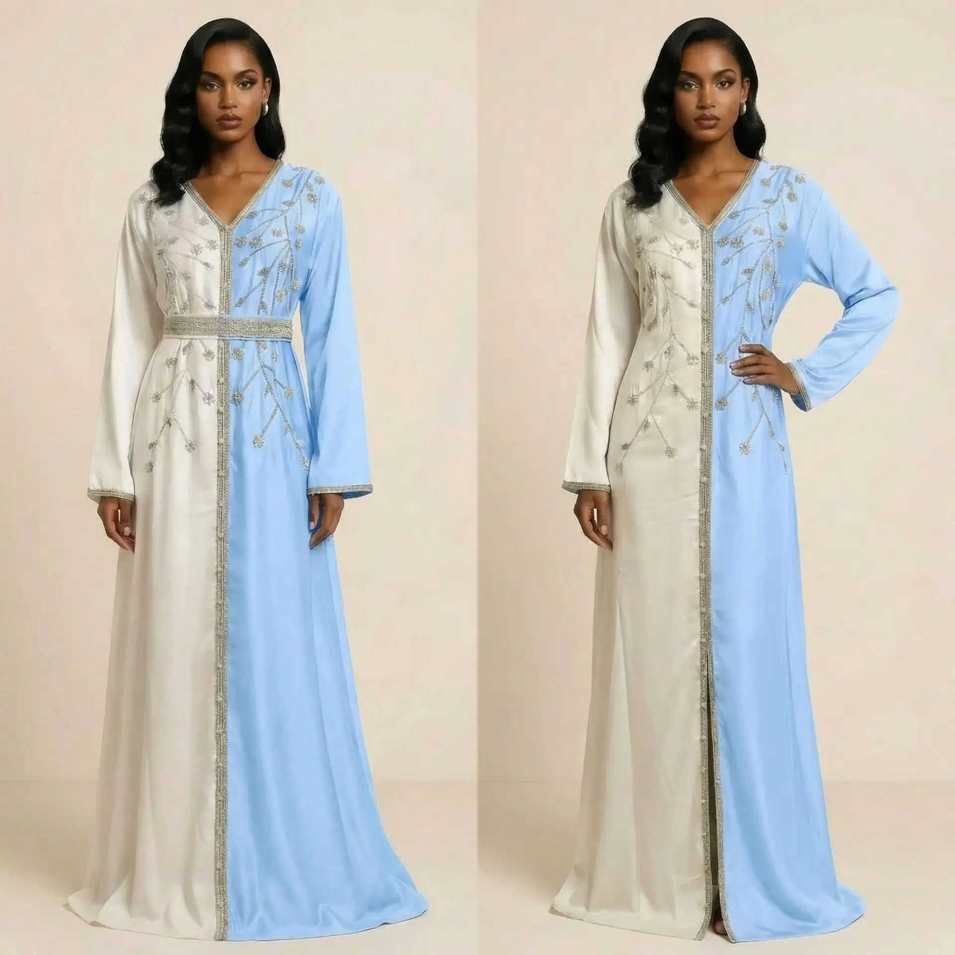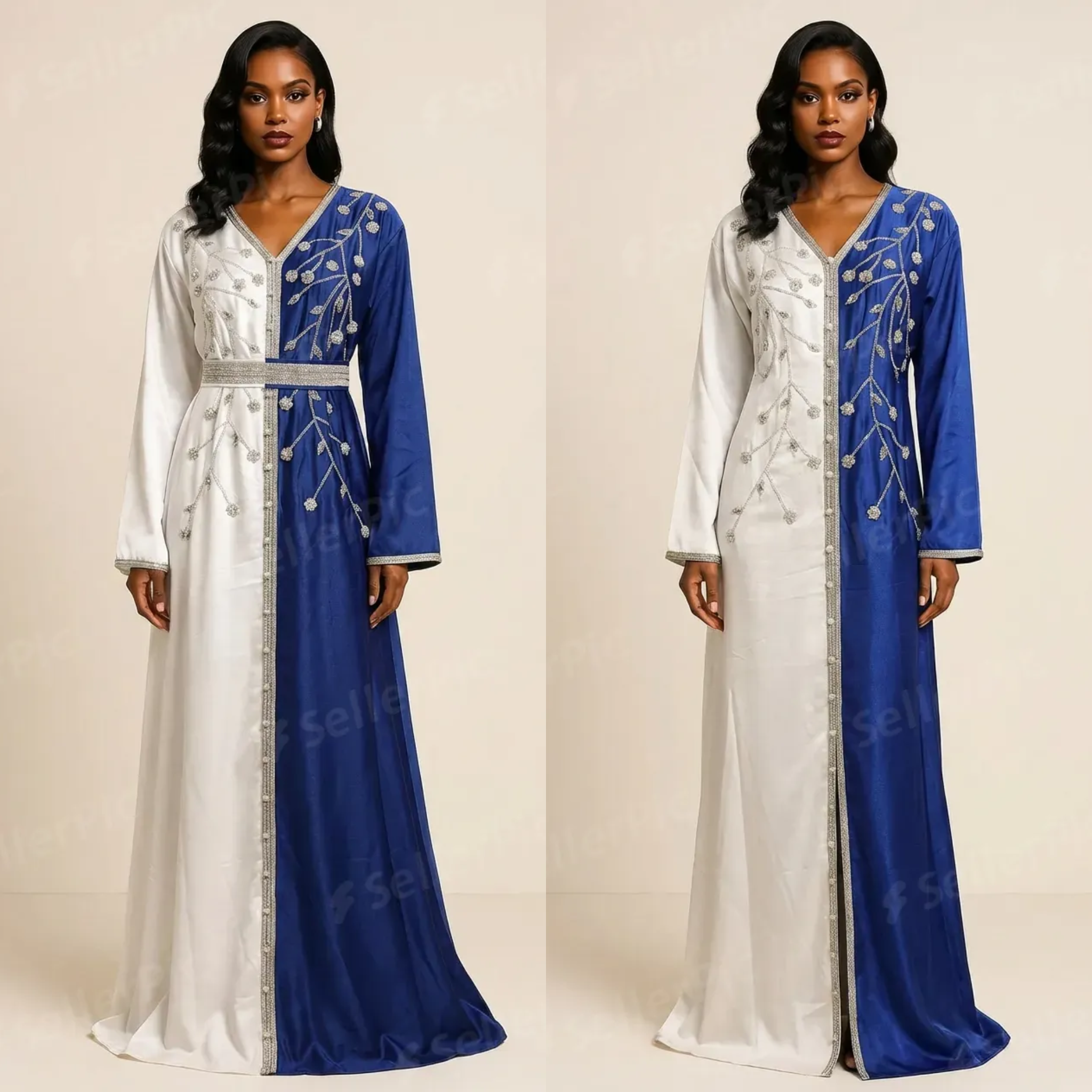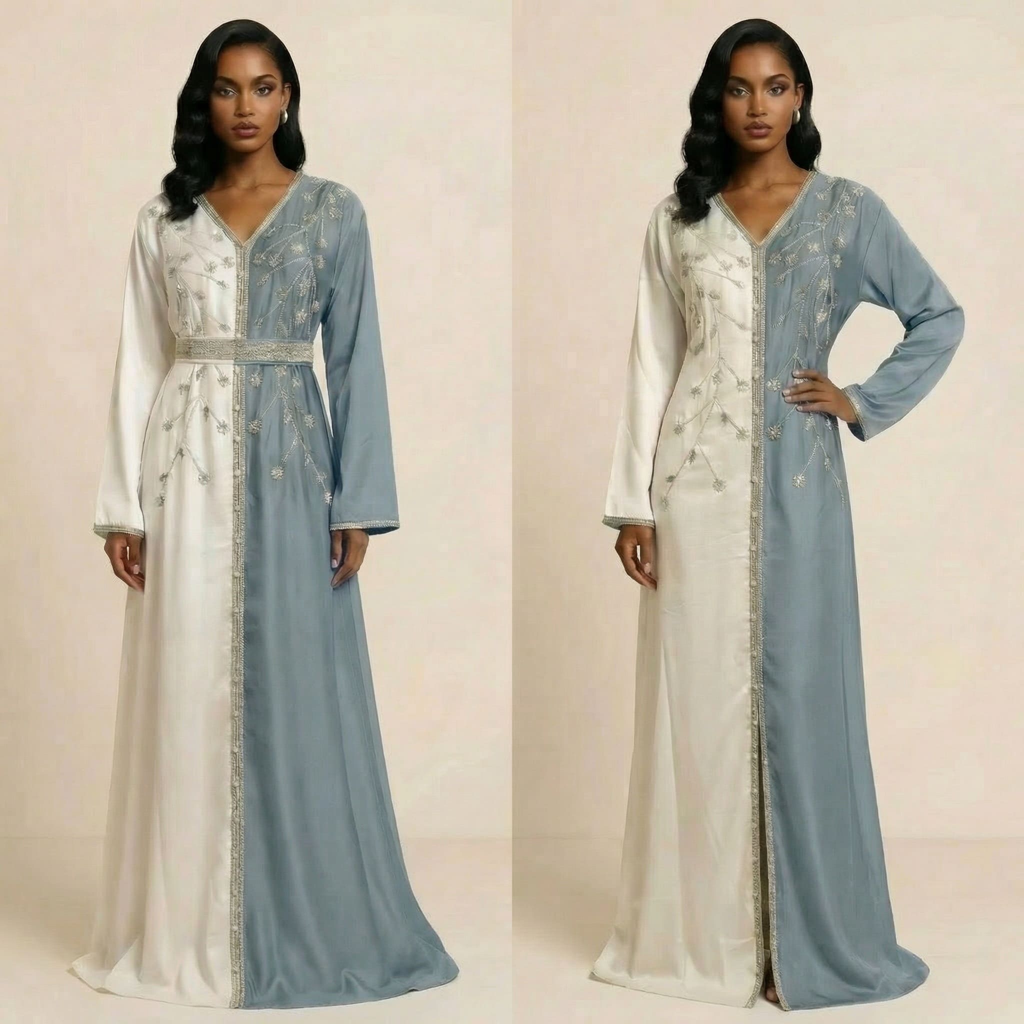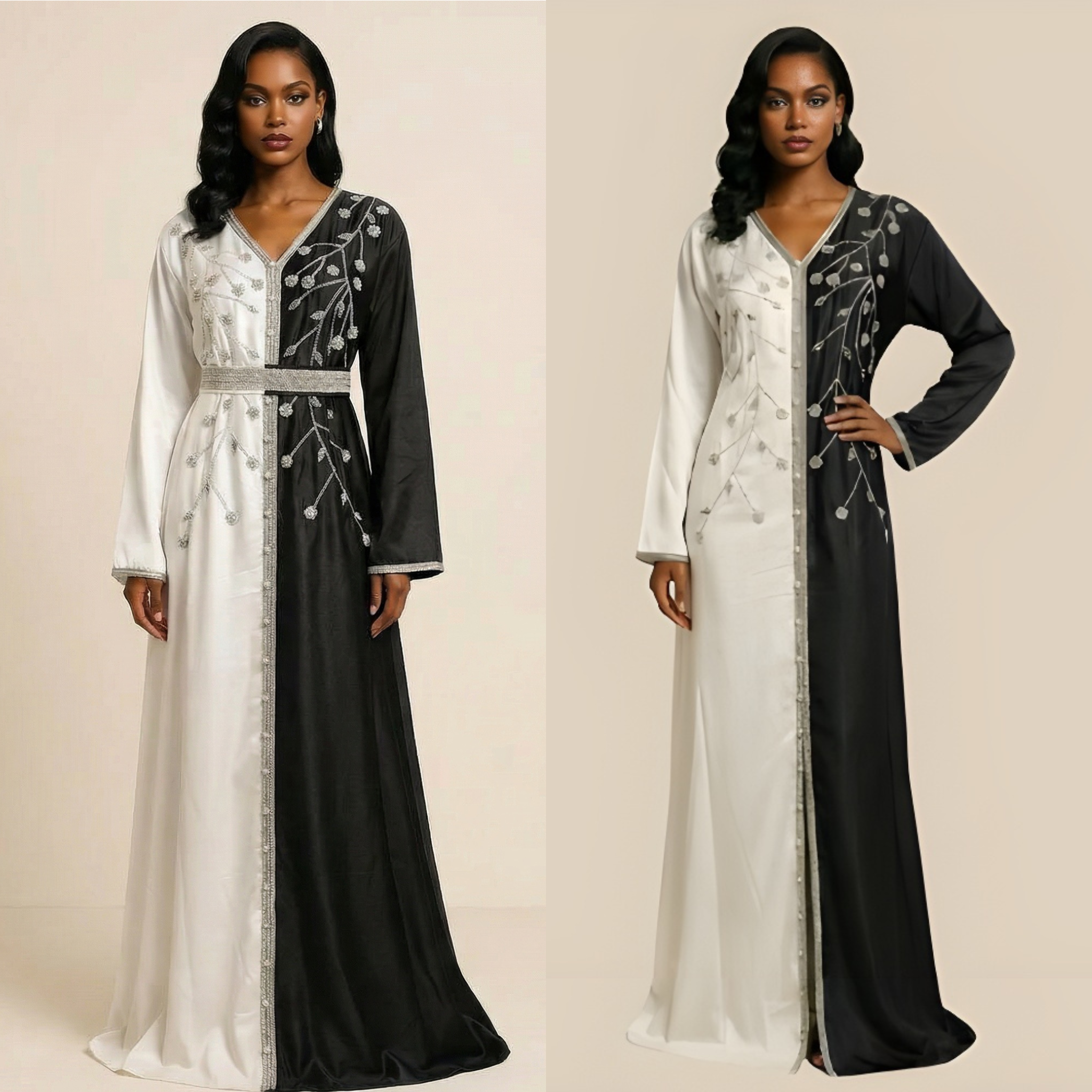 تألقي بإطلالة راقية مع هذه الجلابية الفاخرة المصممة بأسلوب النصفين المتناغمين من قماش فاخر ناعم الملمس، يتوسطهما تطريز كريستالي أنيق يمنح التصميم لمسة من الفخامة والرقي. تصميم يجمع بين الأناقة العصرية وجمال التفاصيل ليمنحك حضوراً مميزاً في كل مناسبة.